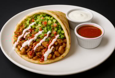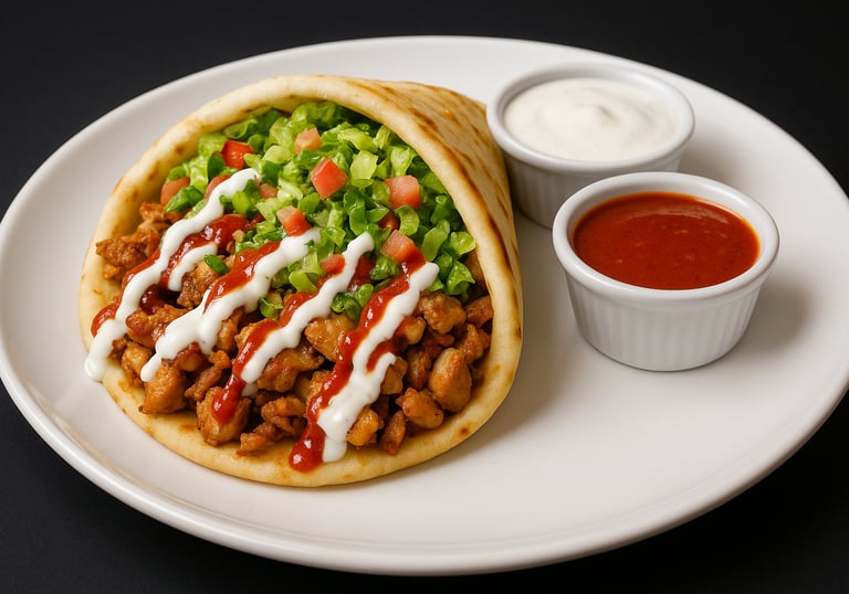 Your choice of juicy grilled chicken, tender lamb, or a mix of both — wrapped in soft pita with fresh salad and our signature white & hot sauces.