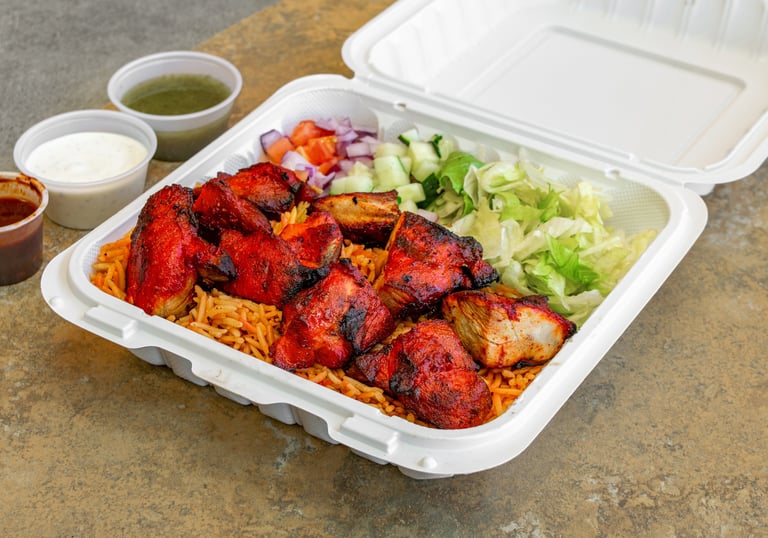 Succulent boneless chicken marinated in yogurt and bold tikka spices, flame-grilled to perfection, and served over a bed of flavorful rice with fresh salad, and our famous white and hot sauces on the side.