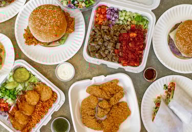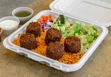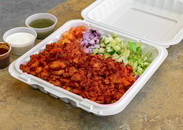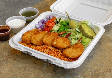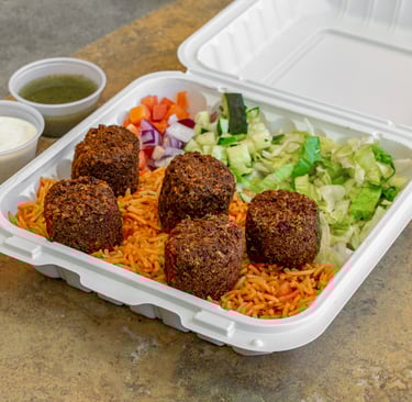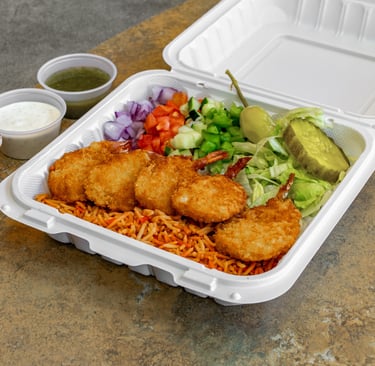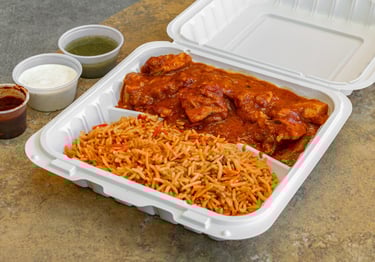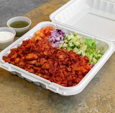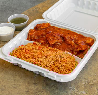 Chicken, lamb, jerk, mix, falafel, butter, fish, shrimp, and tikka, Mac & Cheese, served over rice with white & hot sauce.