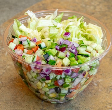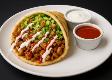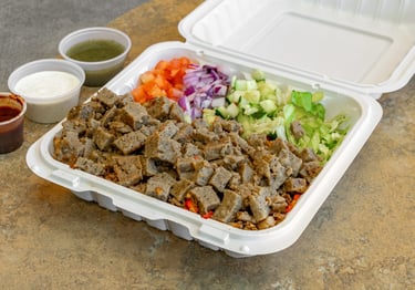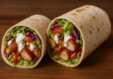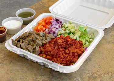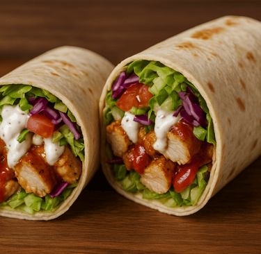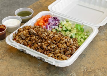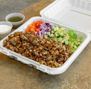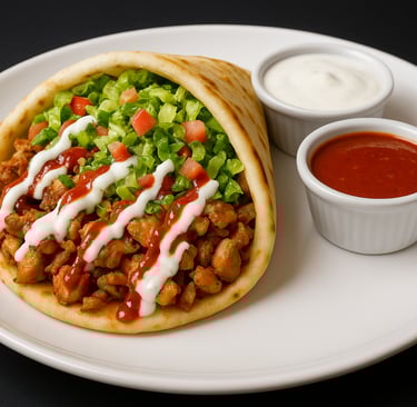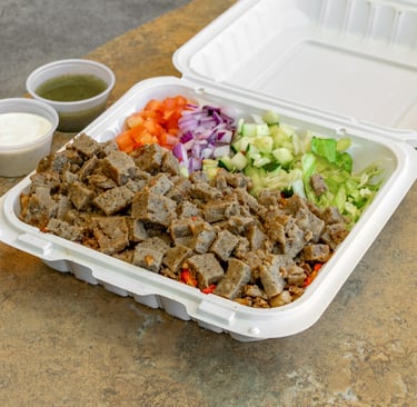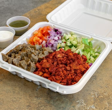 Any type of protein or salad elements wrapped in Pita bread or a burrito roll inclusive of salad, white & spicy sauce.